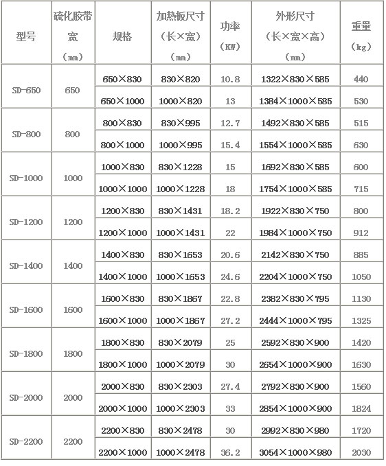 “盛大伟业”品牌SD-型系列电热式胶带硫化机,是输送机械胶带接头硫化胶接的专用设备。 该机采用轻质铝合金材料制造,体积小,单件重量轻,普通三相电源供电,热板温度均匀,水压系统供给(1.0~2.0mpa)均匀压力,配有轻型全自动液晶数显温控箱,温控箱与主机的连接由一体化插件及多芯电缆完成,操作方便,工作可靠。同时又具有升温快,温度均匀,热效率高等特点,是一种输送机械橡胶带接头的理想胶接设备。